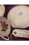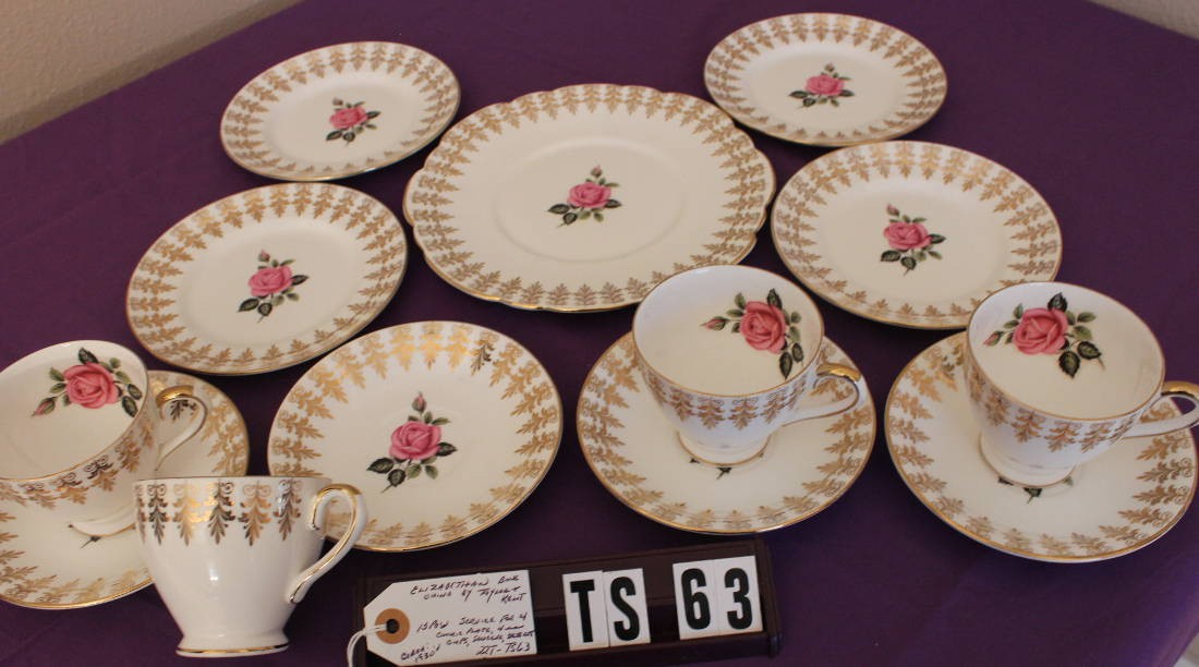 This beautiful Elizabethan Fine Bone China Tea Set by Taylor & Kent Consists of a Bright White Background, Very Dramatic Pink Roses and Rosebuds at the Center of this set. Also includes an enormous amount of 22kt Gold Filigree. Tea Cups and Creamer are Footed, with 22kt Gold Trim & Handles, and Rose Print on the inside of the cups. All Rims of Plates and Cups have 22kt Gold Trim. Lovely to show at anytime... Beautifully Hand Painted. In Great Resale Condition unless noted below or in pictures.- 4 - Cups - 2 7/8" Tall - Footed