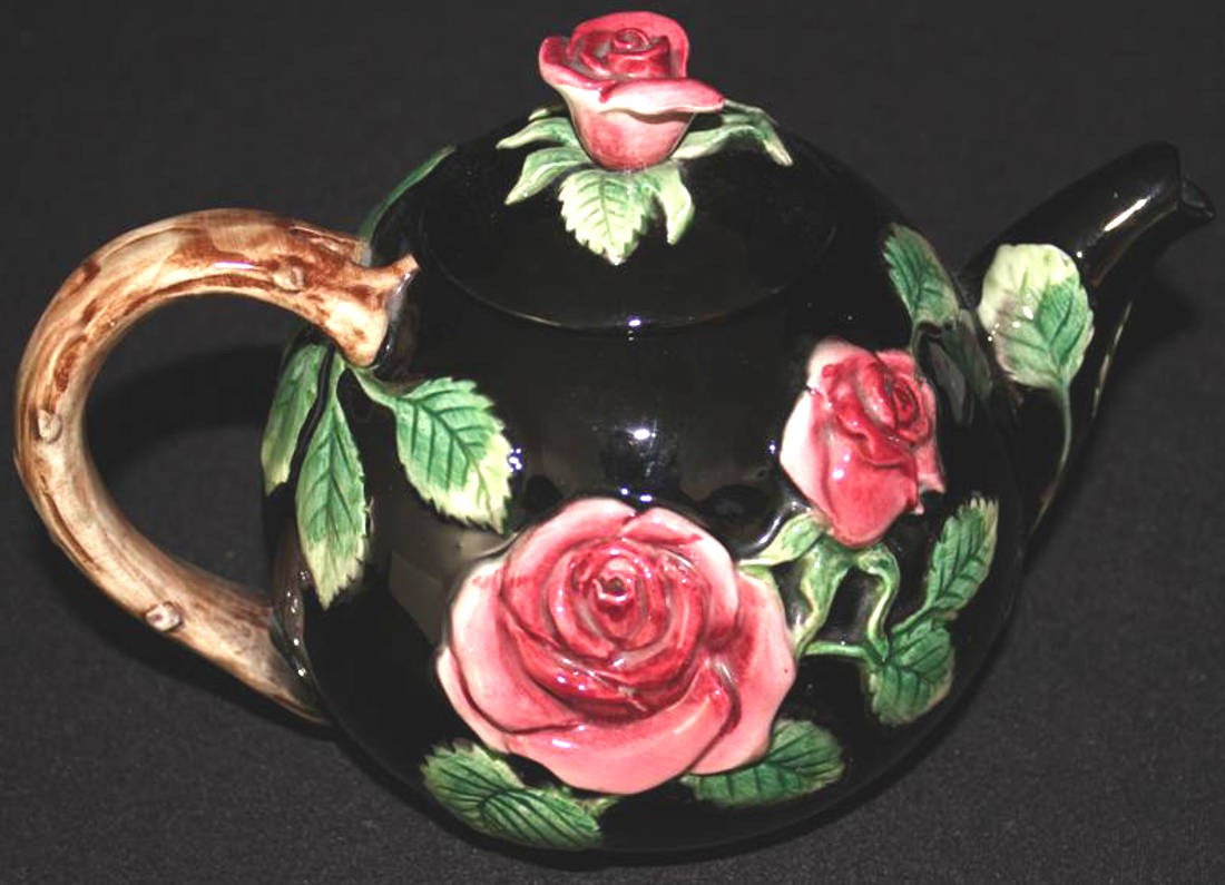 This is a Lovely Black Ceramic Six Cup Size Teapot by Fitz and Floyd, called "Midnight Rose". It is in the Globe Shape, with Raised Red and Pink Roses on Both Sides, and Rosebuds as the Knob to Lift the Lid. The Handle of the Teapot is Brown in the Shape of a Rose Branch, and the Leaves are Shades of Green. Very Good Resale Condition unless noted below or in pictures. Just absolutely beautiful..