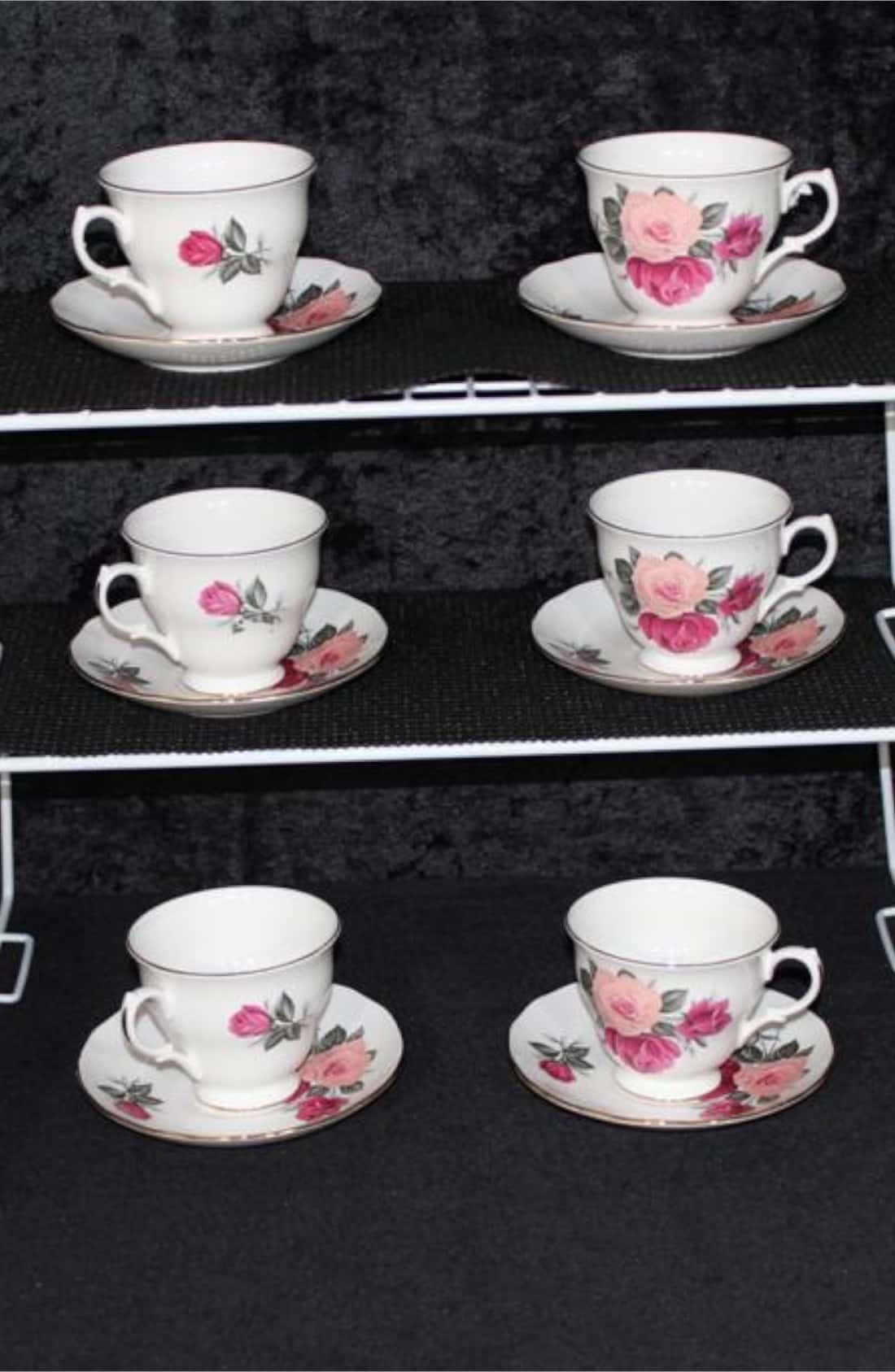 Vintage - Beautiful Gainsborough Bone China Pieces in the Peach & Red Rose (H 37 7) Pattern. Made in England for a short period of 1952 through 1955. (18) Pieces consisting of (6) Trio's, Priced as one.