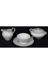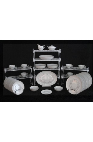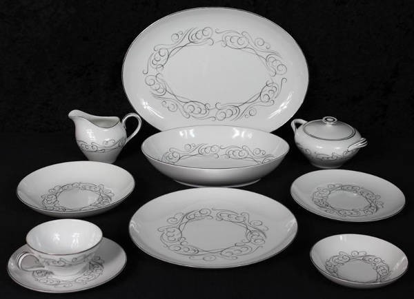 Complete Service for (6) with extra pieces. Lovely White Plate with Black "Scroll" Pattern in Center, and a Platinum Rim. Can be used with other China for Accents, or very Elegant when used alone for Luncheons, Dinner Parties or Buffets.- 6 - Cups - 2 1/8"