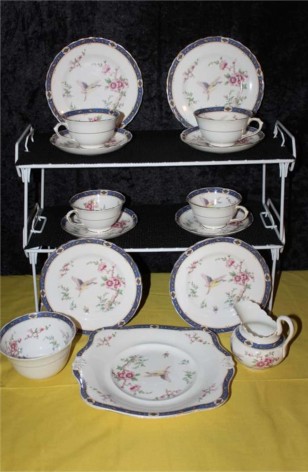 Beautiful Antique Art Deco Tea Set, Pattern #8357 by Tuscan/Royal Tuscan China in England. This is a lovely Floral and Bird Pattern, surrounded by Blue Band and 22kt Gold Scrolls in the Band. Floral is in shades of Pink on Tree like Stem with Duck in Flight. Pattern has a similar feel as the Indian Tree by another manufacturer. Lots of 22k Gold Trim on Rims. All Pieces are in Great Resale Condition unless otherwise noted in pictures, or below: